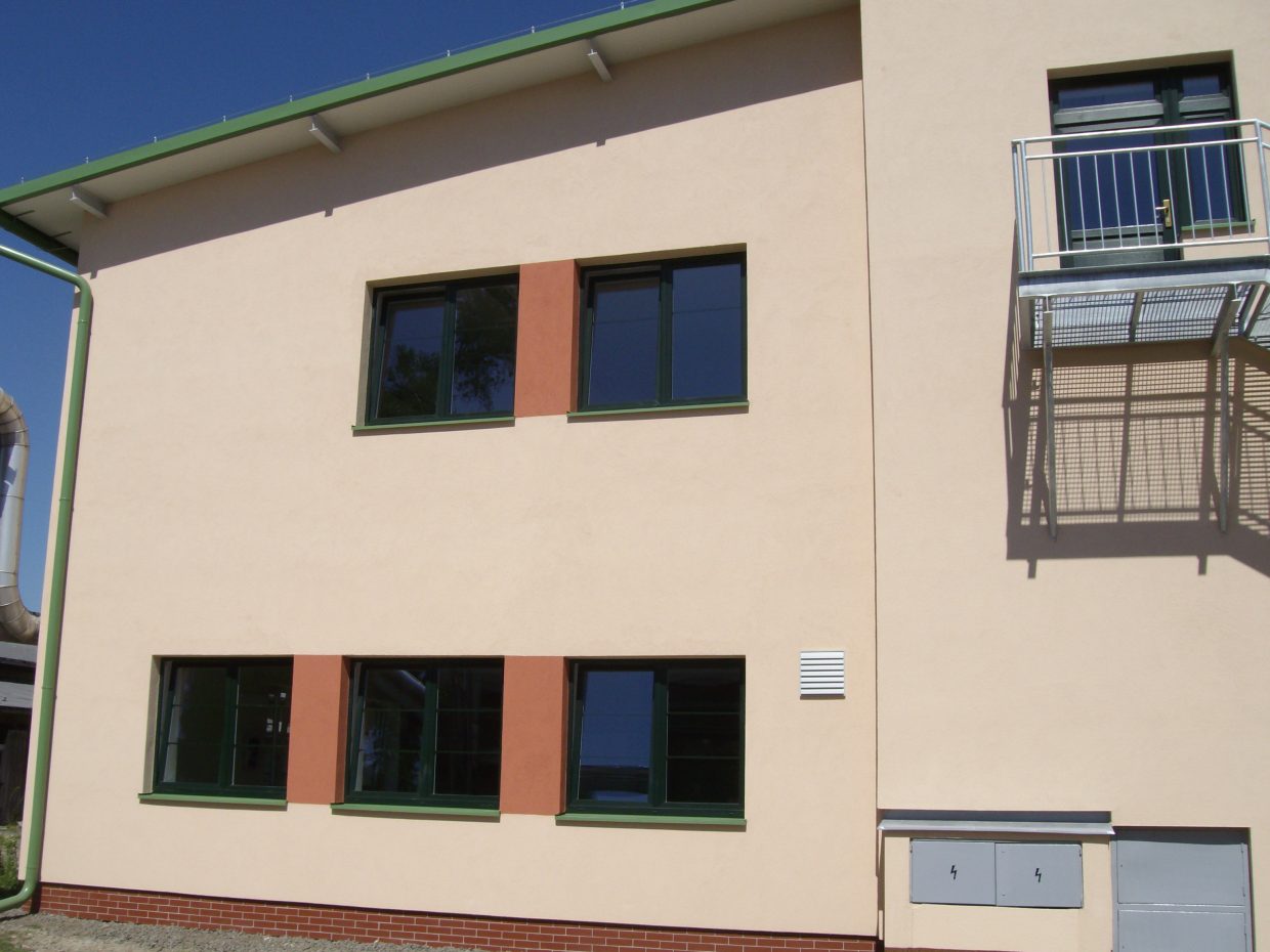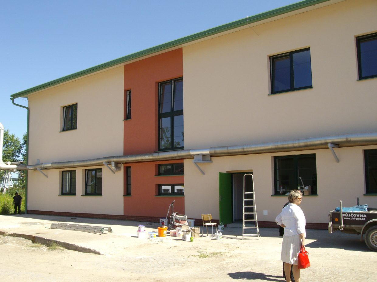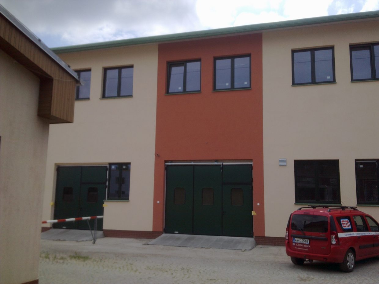 Nový objekt je dvoupodlažní a zateplený, s novými plastovými okny, novými zateplenými vraty a s únikovým ocelovým schodištěm na jihovýchodní straně.