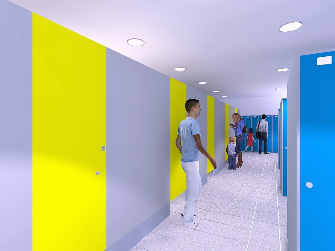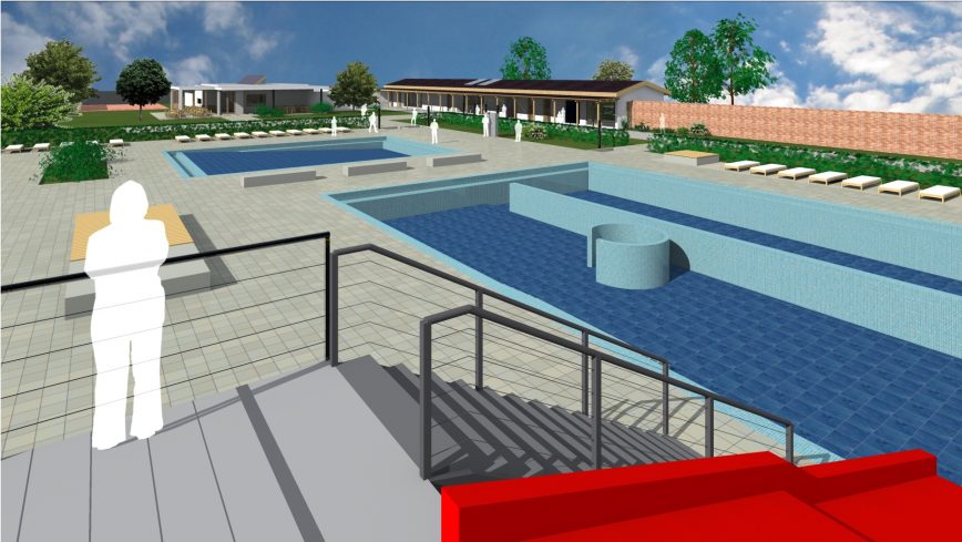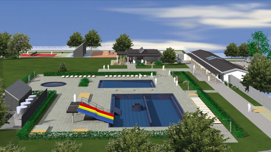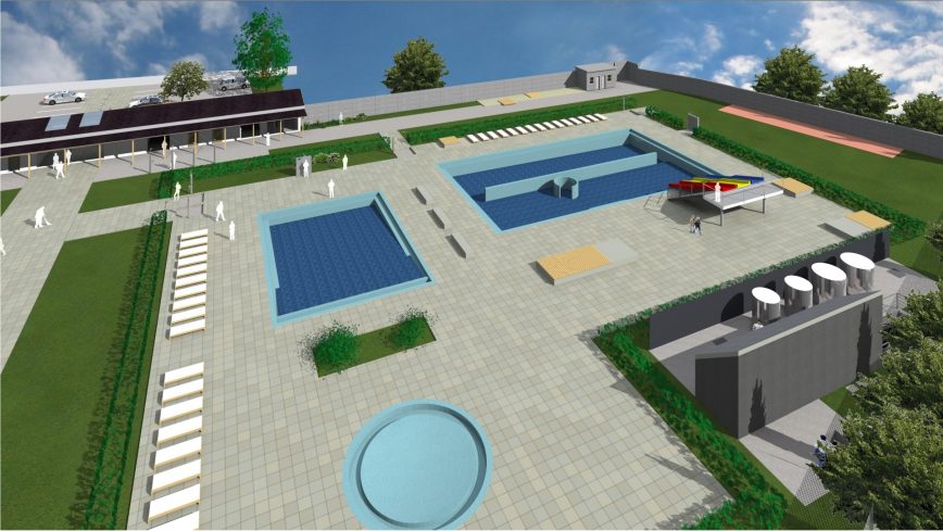 Výstavba tří bazénů – (dětský, brouzdaliště a velký), čtyři brodítka,  trojskluzavka se schodištěm, dětské hřiště s herními prvky a ping-pongovými stoly, bistro