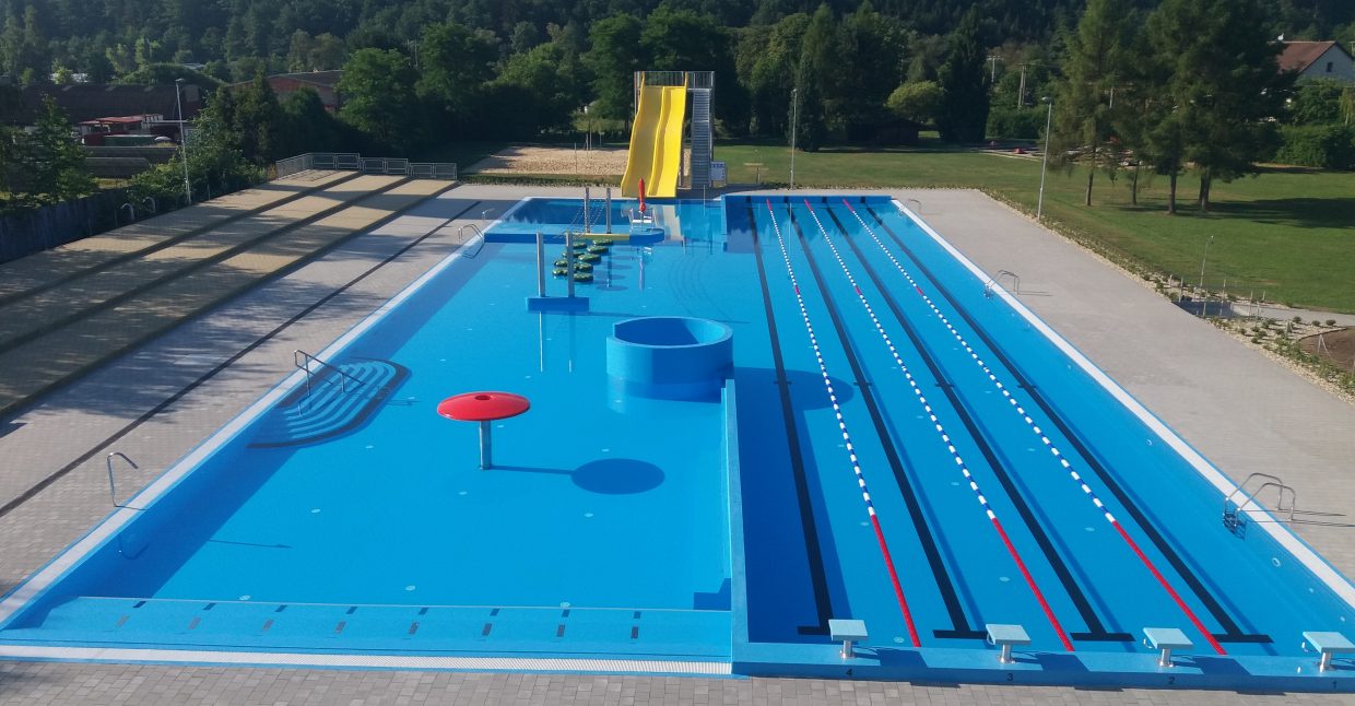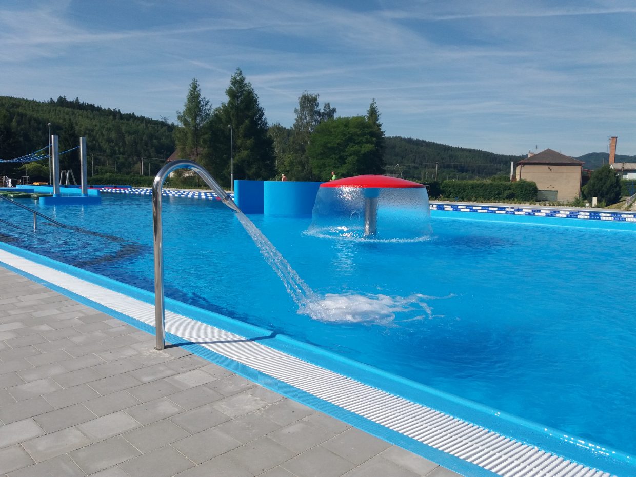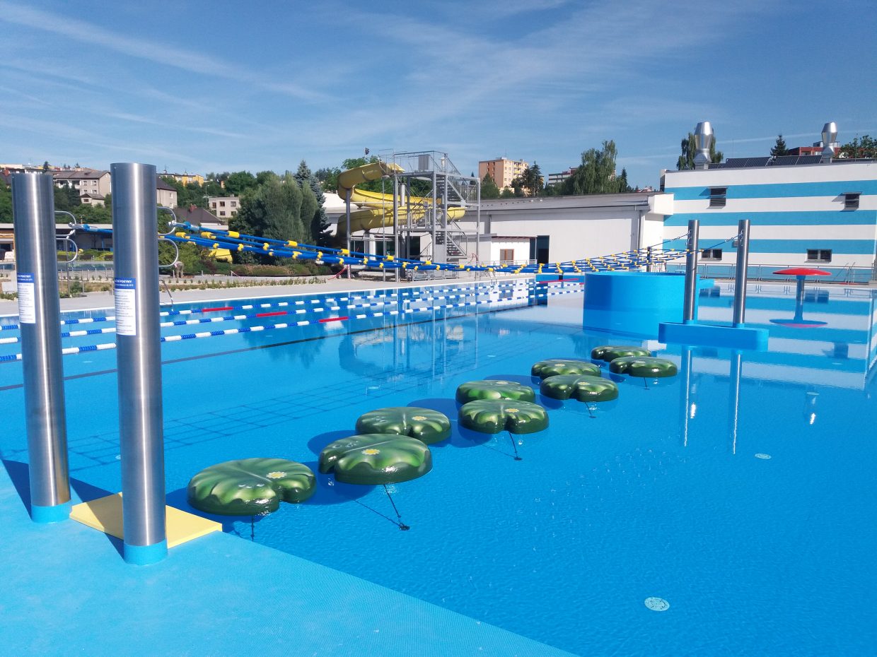 víceúčelový 50 m bazén se 4 plaveckými dráhami, rekreační bazén s masážními lavicemi, vodní chrlič, vodní hřib, plovoucí lekníny (překážková dráha), 20 m dlouhá skluzavka